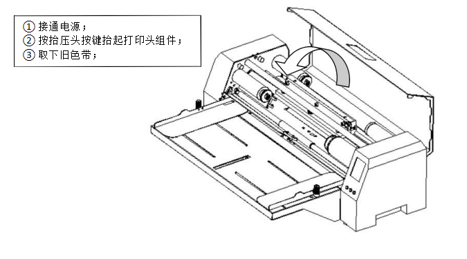 第一步:按下打印機(jī)上抬壓頭按鍵,打印頭組件會(huì)自動(dòng)抬起。