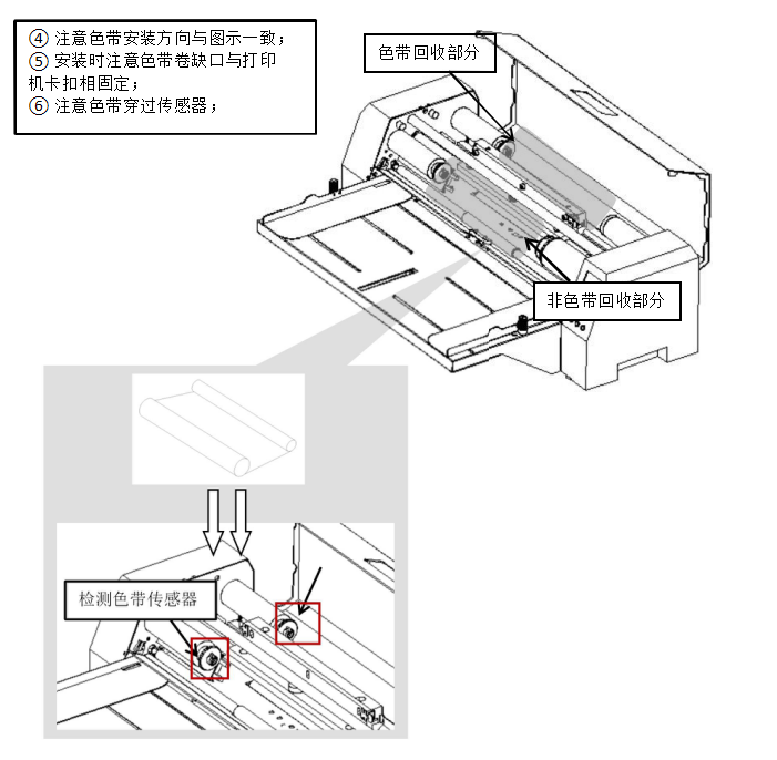第三步:將色帶(主軸)一端繞過熱敏片,注意色帶必須穿過傳感器位置,將回收色帶部分如圖所示方向卷起,先用力按壓彈力座一邊將色帶裝入, 再在另外一邊對(duì)準(zhǔn)卡扣位置安裝,色帶安裝完成后。通電,按收色帶按鍵可收緊色帶,并按抬壓頭按鍵歸位。