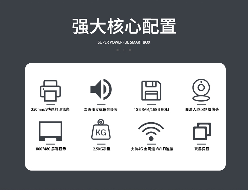 1.中央處理器六核64位,Android 6.1操作系統 2.智能掃一掃支付具有雙聲道立體音喇叭 3.高清AI人臉識別攝像頭,觸摸屏雙屏異顯 4.支持4G全網通/WIFI/藍牙連接,支持微信支付寶云閃付等移動支付