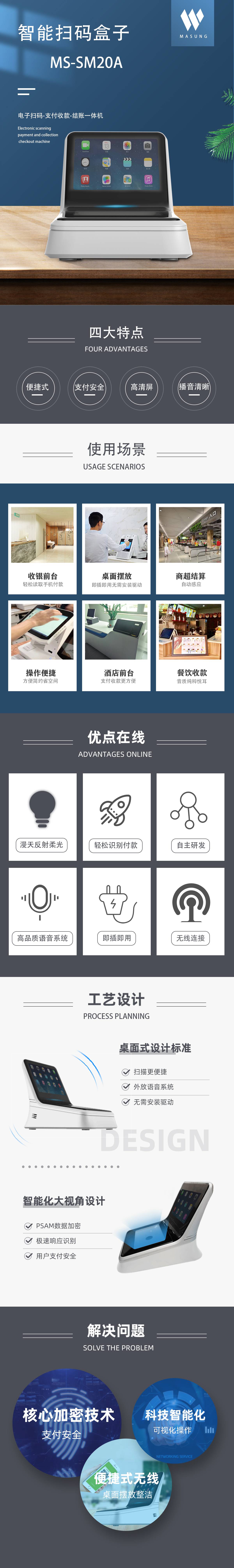美松二維碼支付收款機MS-SM20A智能盒子采用掃一掃,二維碼,雙聲道立體音喇叭外放,商家只需用戶提供收款碼就可實現快速收款的收款機,二維碼掃描,對商家收款帶來便利,對用戶二維碼支付提供安全,交易實現快速精準安全模式.電子掃碼,支付收款,結賬一體的設備,支持微信,支付寶,公交碼支付,掃碼成功語音播報 ,解放收銀員,更避免漏單,接口:網口,4G和USB,經典外觀設計。