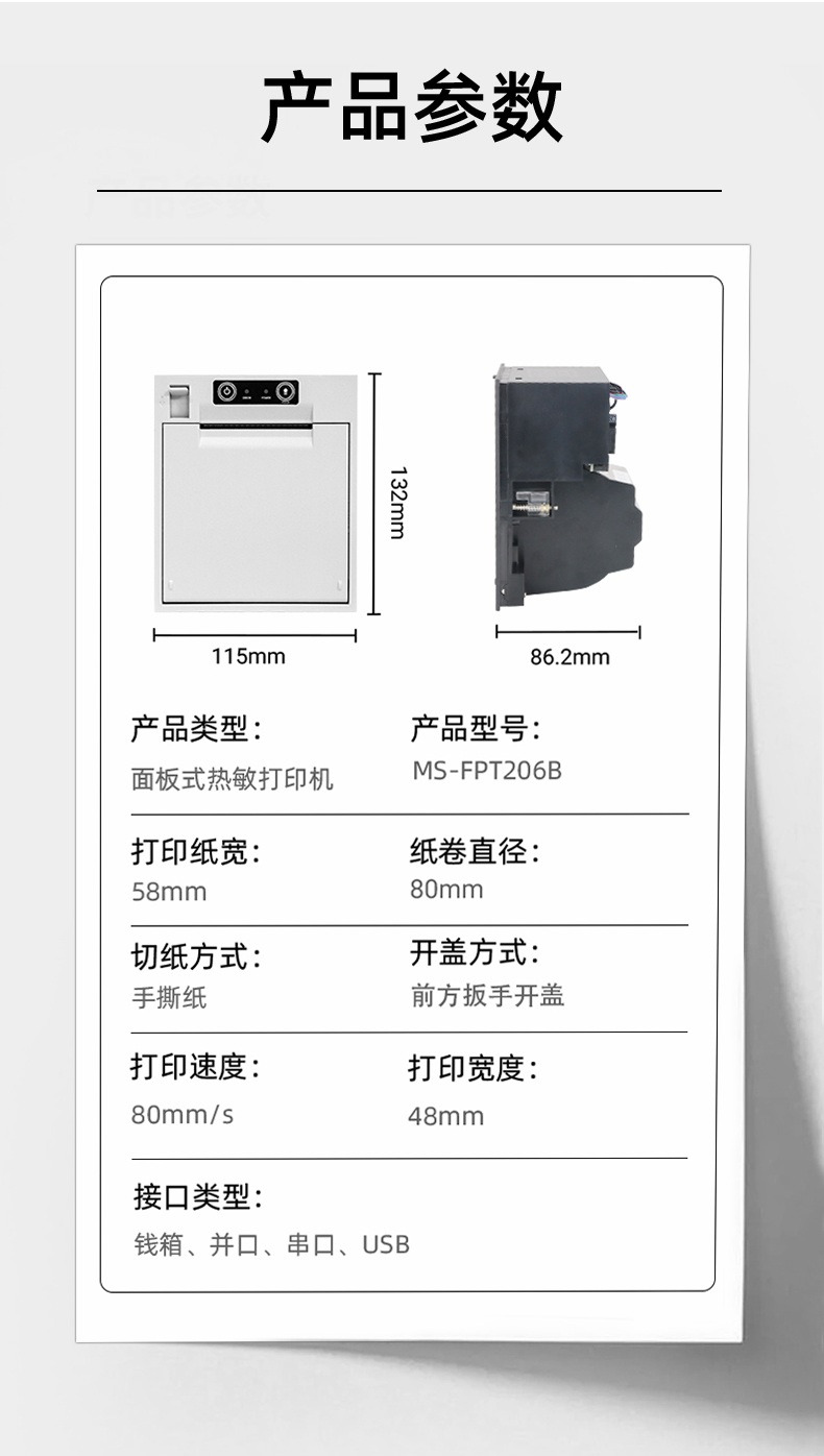 MS-FPT206 打印模塊采用行式熱敏打印頭,它具有高速打印、噪聲低、可靠性強、打印質量高、結構小巧等特點,使安裝維修更方便快捷
