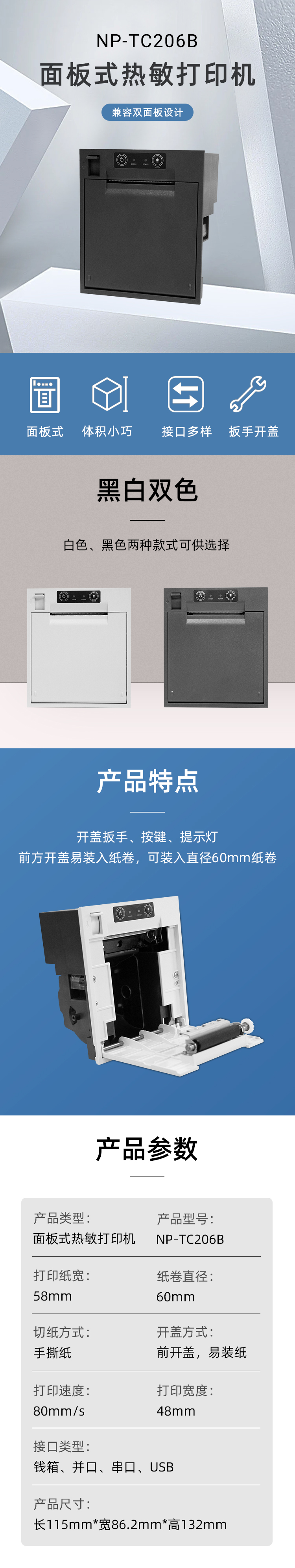 1.面框可以兼容80mm打印機(jī)安裝尺寸 2.擁有易裝紙、手撕切紙等功能 3.設(shè)計精巧,操作簡易等特點(diǎn) 4.開蓋扳手加軸強(qiáng)度高、黑標(biāo)傳感器(可選)等優(yōu)良特性 5.零售、餐飲、娛樂、醫(yī)療、物流等行業(yè)的自助終端設(shè)備理想打印伙伴