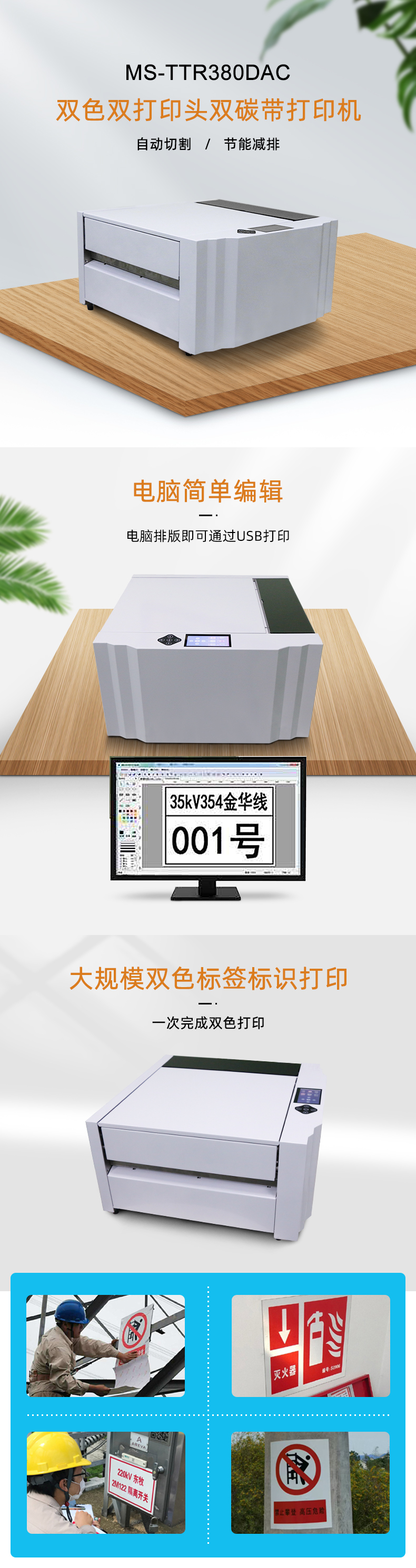 美松MASUNG自主研發熱轉印雙色標識牌打印機 1.打印大幅面標示牌,且自動切割 2.無需制版,電腦排版完通過USB打印,方便快捷 3.碳帶熱轉印方式打印,文字清晰耐刮永不褪色 4.支持PVC+貼合鋁箔復合材料、PVC標識貼紙材料等打印 5.熱轉印打印防水防曬耐腐蝕,經久耐用