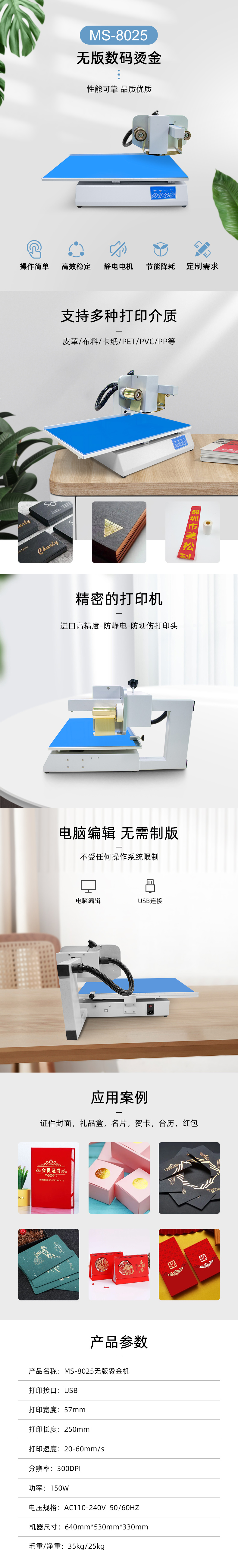美松無版數碼燙金機MS-8025采用日本原裝rohm打印頭,最新設計徹底取代傳統的燙金機。身材小巧、節約空間重量、方便移動;最大打印厚度可達30mm、用途廣泛。軟件控制、可加工復雜圖案文字照片等,可在不光滑的卡紙、皮革上燙印各種圖案文字。用戶無需制版、開模,功率低,經濟快捷,簡單操作,一看即懂,輕松自如。
