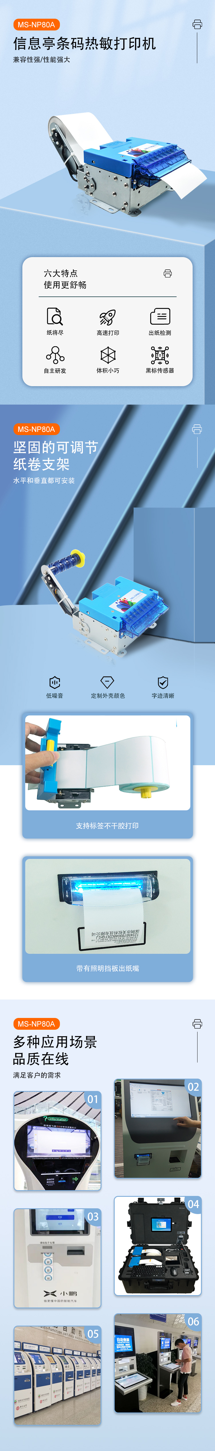 MS-NP80A作為自助設備的一部分,主要靠裝入的自助設備來決定使用的地點,可以運用在銀行的排隊機上,進行排隊號碼的打印,高速的打印特點可以有效的防止人員的擁擠,,大紙卷可以長時間的使用,支持多種大小的票據打印,更方便使用。