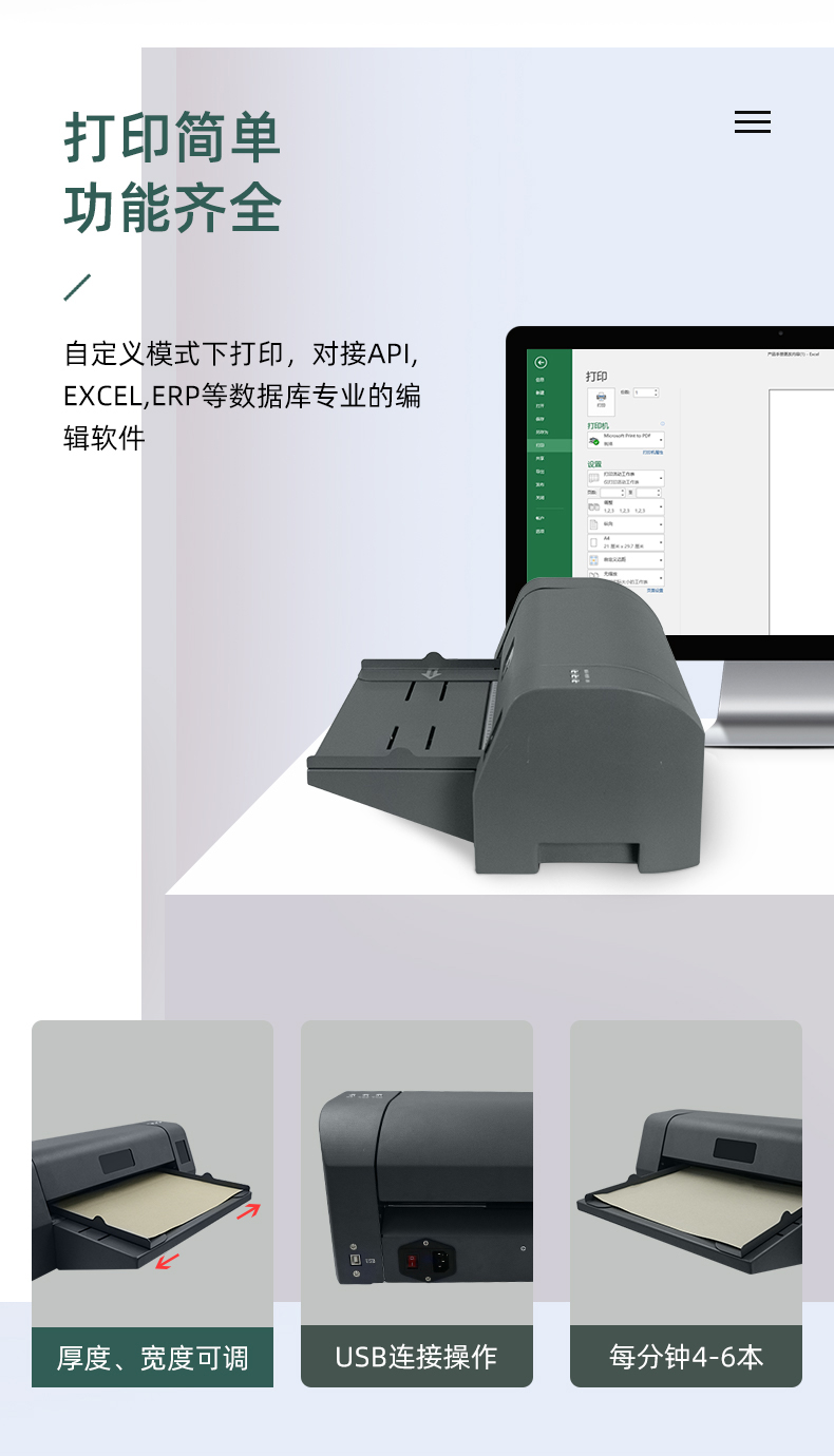 美松MASUNG自主研發(fā)熱轉印封面打印機 1.專業(yè)打印牛皮紙,不動產等證件內頁,無酸紙檔案盒 2.對接API,EXCEL,ERP等數據庫專業(yè)的編輯軟件,自定義打印 3.USB連接操作簡單,耗材成本低,長久保存 4.快速打印,每分鐘4-6本,整齊規(guī)范化 5.進紙厚度可調,適合不同封面打印