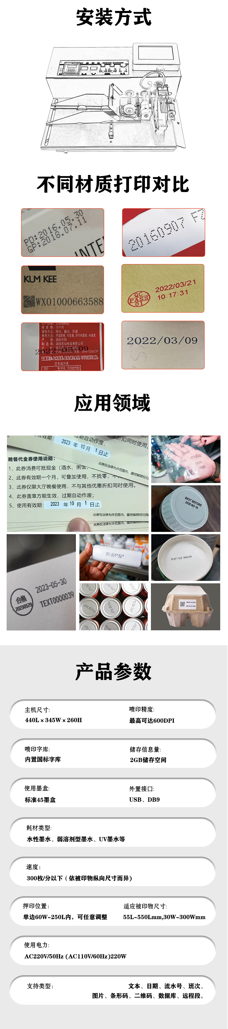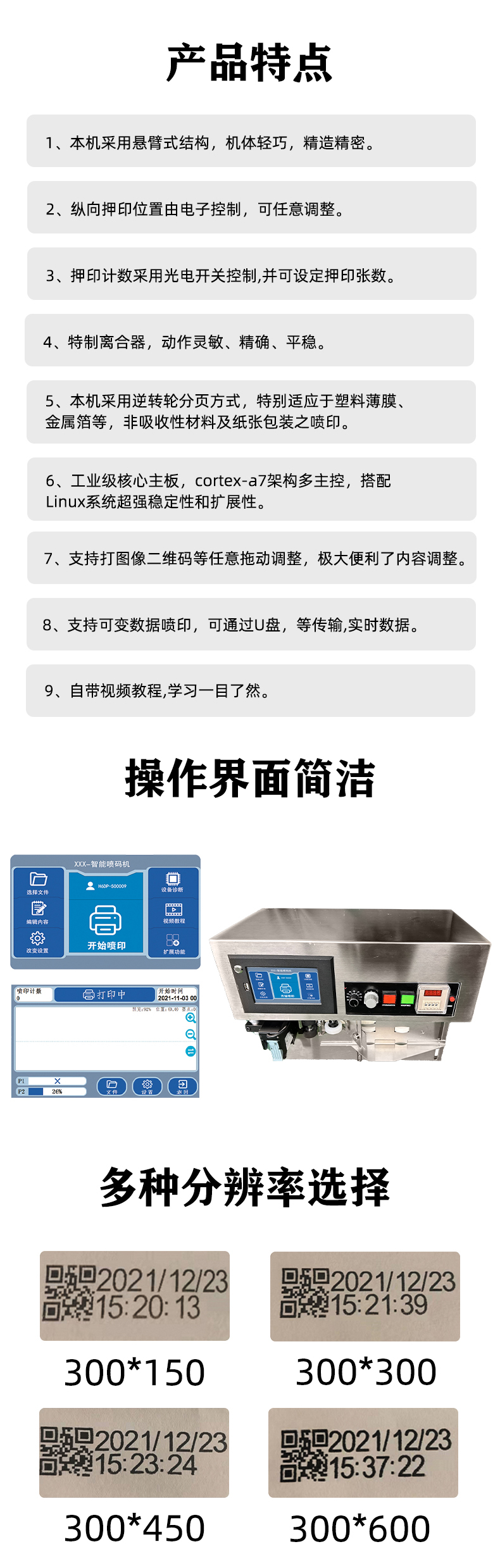 1、本機采用懸臂式結構,機體輕巧,精造精密。 2、縱向押印位置由電子控制,可任意調整。 3、押印計數采用光電開關控制,并可設定押印張數。 4、特制離合器,動作靈敏、精確、平穩。 5、本機采用逆轉輪分頁方式,特別適應于塑料薄膜、 金屬箔等,非吸收性材料及紙張包裝之噴印。 6、工業級核心主板,cortex-a7架構多主控,搭配Linux系統超強穩定性和擴展性。 7、支持打圖像二維碼等任意拖動調整,極大便利了內容調整。8、支持可變數據噴印,可通過U盤,等傳輸,實時數據。傳輸,實時數據。