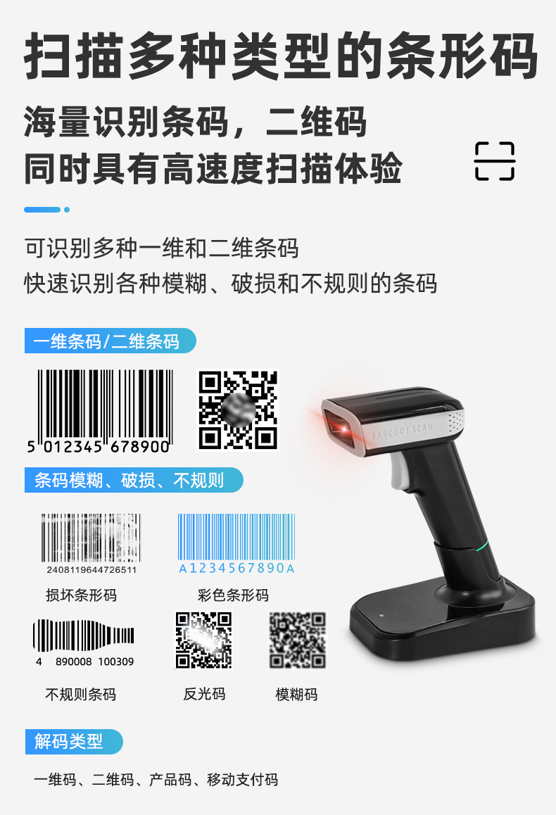 采用高速曝光算法,兼容手機(jī)碼和紙質(zhì)碼的
